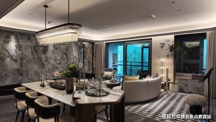 样板间是做了横厅设计,实际交付为4房,这个横厅连同书房面宽约6.9米,仅客厅面宽约为4.2米;电视机背景墙是雪山蓝岩板,也是交付的;室内地面的材质铺装选用1.8米*90公分的大砖密拼而成,几乎看不到缝隙;包含阳台移门在内,所有窗户均为三玻两腔。