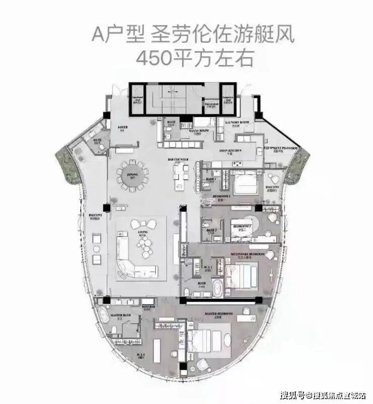 建面约450㎡四房 / 五房两厅六卫:单价约3.8-4.0 万 /㎡,总价约1600-1680 万;香奈儿 / 游艇风,17 米超大弧形阳台,双主卧套房