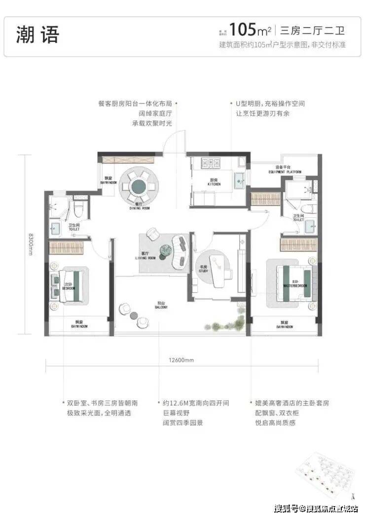 项目的户型起步就是四开间朝南的建面约105方三房: