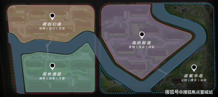 罕见双自然水系!一横一纵2条水系将项目地块一分为三,形成三座天然“岛屿社区”,这在市面上非常少见。