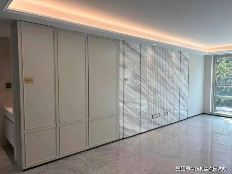 餐客厅地面、背景墙均使用天然大理石,连电梯厅入户都是石材拼花。