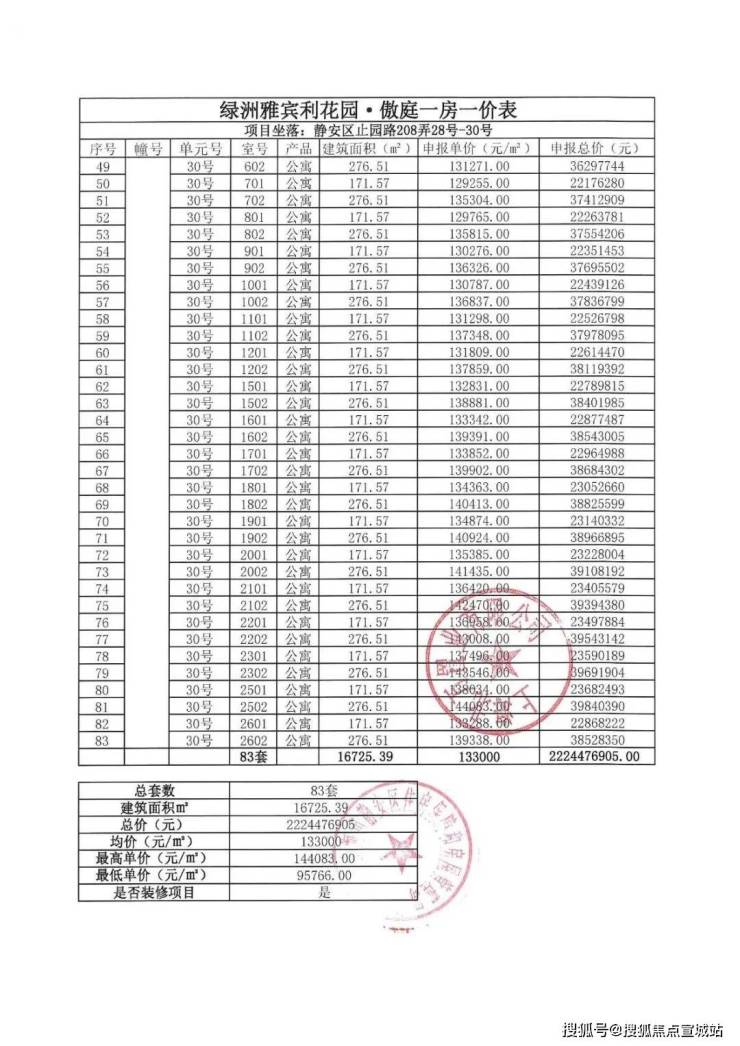 上期一房一价表如下