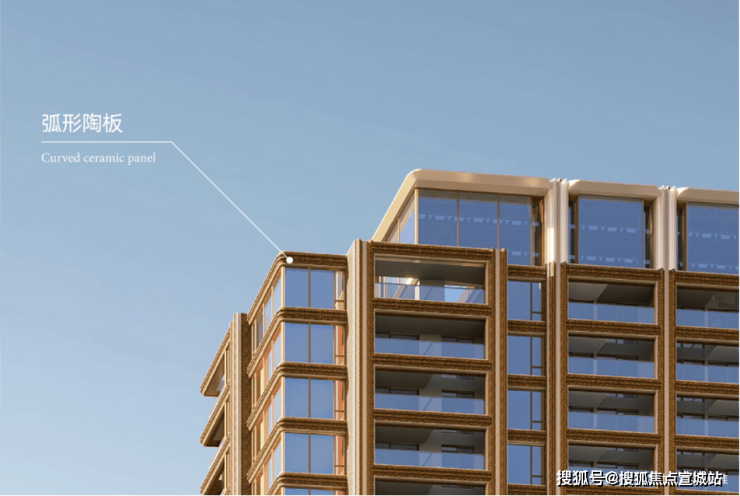 建筑四面均采用铝板+玻璃+定制陶艺,历经百次试烧锻造鎏金陶板,成就上海唯一国际东方艺术全景立面,每面皆城市封面,整体采用非对称的结构设计,回应上海东西方文化交融碰撞的城市美学。大胆采用四排楼布局,以保证户户通风采光,类一梯一户无连廊设计,将入户私密性做到极致。