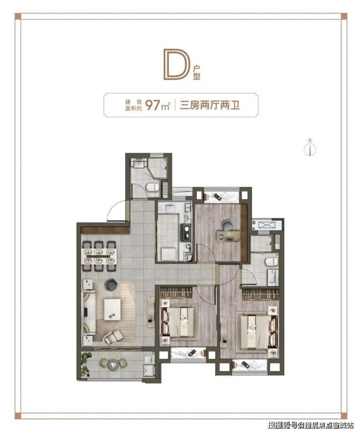 正三房:北卧室往往会被用作书房,面积略小是主要因素。这款产品,北卧室达到约8㎡,完全可以作为房间使用。不足100㎡,同样可以让三代同堂住的舒舒服服。