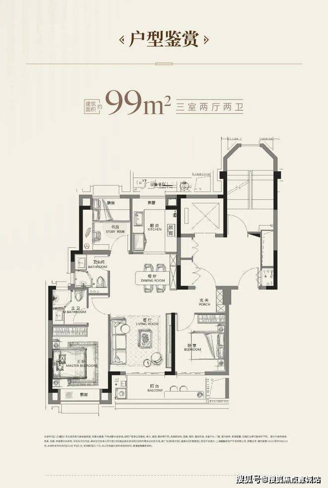 建面约99平米3-2-2飞机三开间朝南户型,动静分区,南北通透,南向面宽约9.5m,采光和通风条件十分优越!