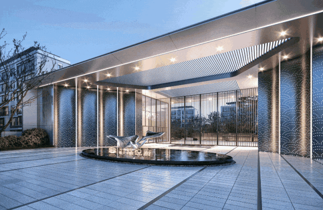 项目打造了南北双酒店式入户大堂,金属质感的造型景墙,配上璀璨的氛围灯,小区中轴曲水流觞,归家仪式感十足。