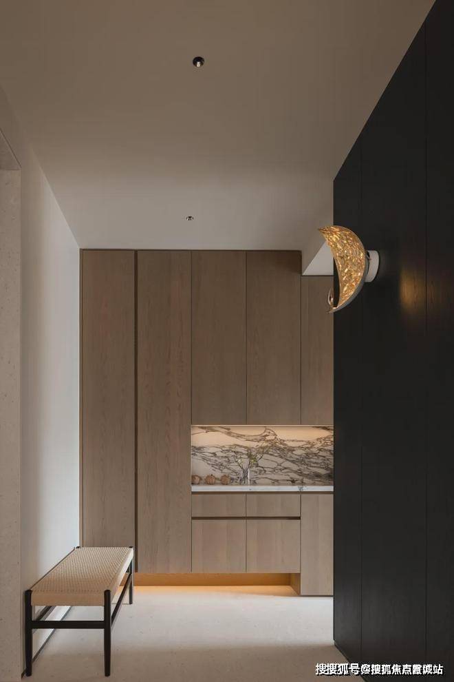 推开家门,一面深邃的黑木墙映入眼帘,如同一幅静谧的画布,仅以两盏独特的装饰灯点缀,仿佛预示归途的灯塔。
