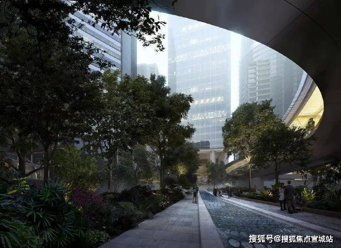 开放式“城市绿桥”直达滨江水岸将下沉广场、活动空间,并且与滨江漫步道贯穿连接,融合城市界面与社区界面,每一栋建筑都仿佛自然生长在这里。