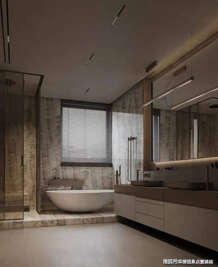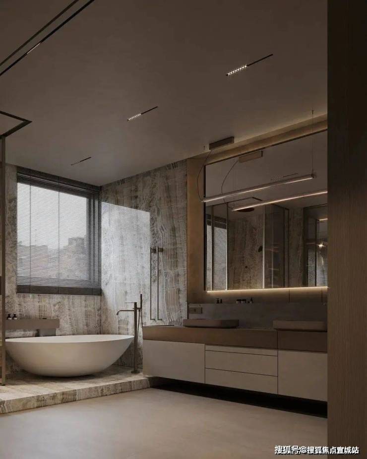 大理石、木饰面、岩板及舒适的中性色沉淀而出空间的大气与高级感,一字铺开的内嵌墙柜与超长的悬浮柜,既简化了视觉系统,也承载着强大的收纳功能.