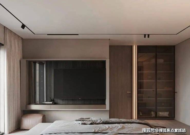 主卧以一种简约优雅的设计语言,呈现出从容不迫的生活质感,床头护墙上木饰面以柔和的曲线展示出一种固态的流动感,栅格及灯光的填充,渲染着空间特有的氛围.