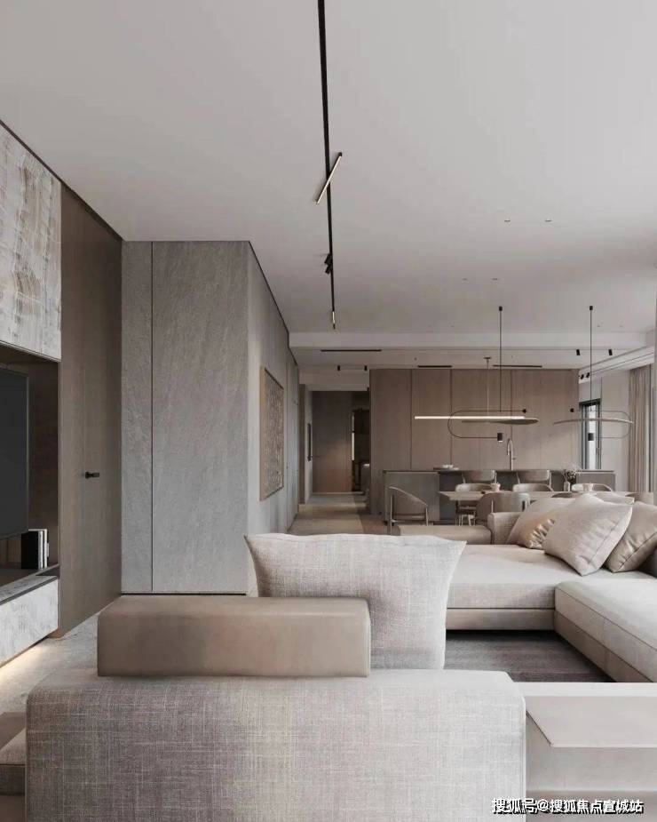 客厅布局开阔,高隔断划分两个区域,以消弭空间界限;设计师以低饱和度的色彩为视觉主轴,呈现软糯优雅的气质,岩板护墙叠加金属装饰,配合着柔和的光线,在深与浅色间显现宁静与包容.