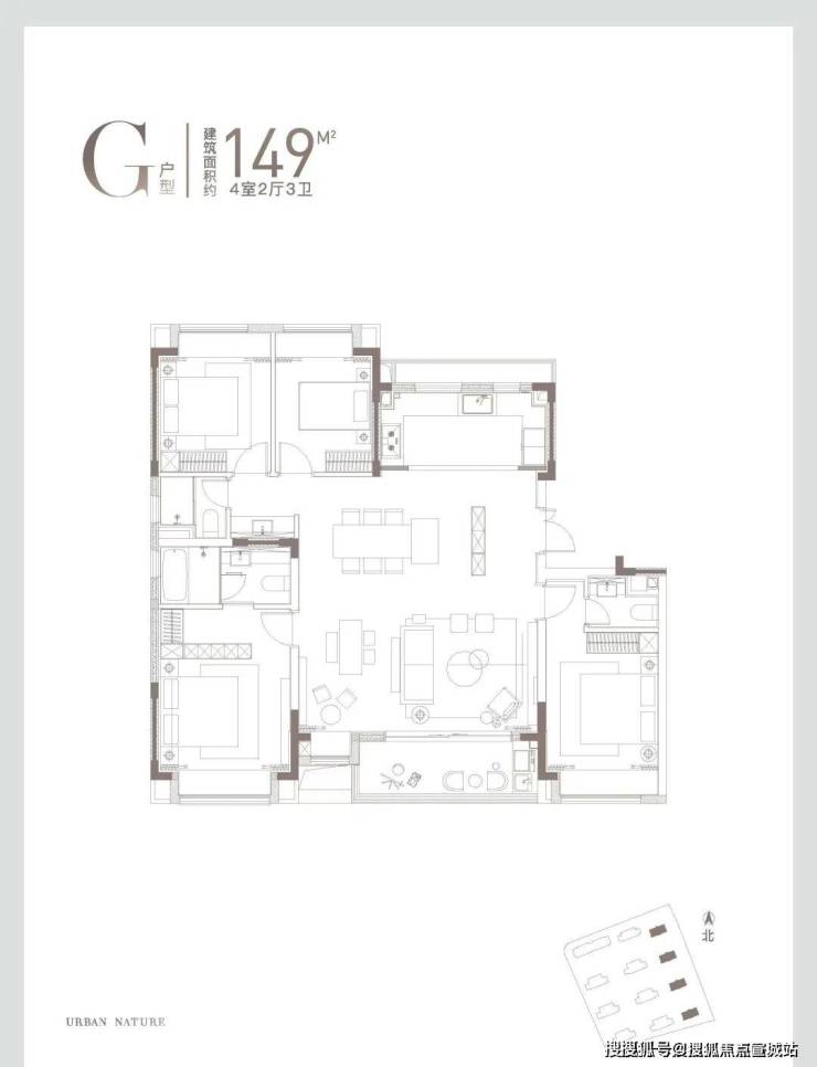 还有部分建面约149㎡滨水四房大平层,仅9-10层,值得注意该户型有“3卫”。
