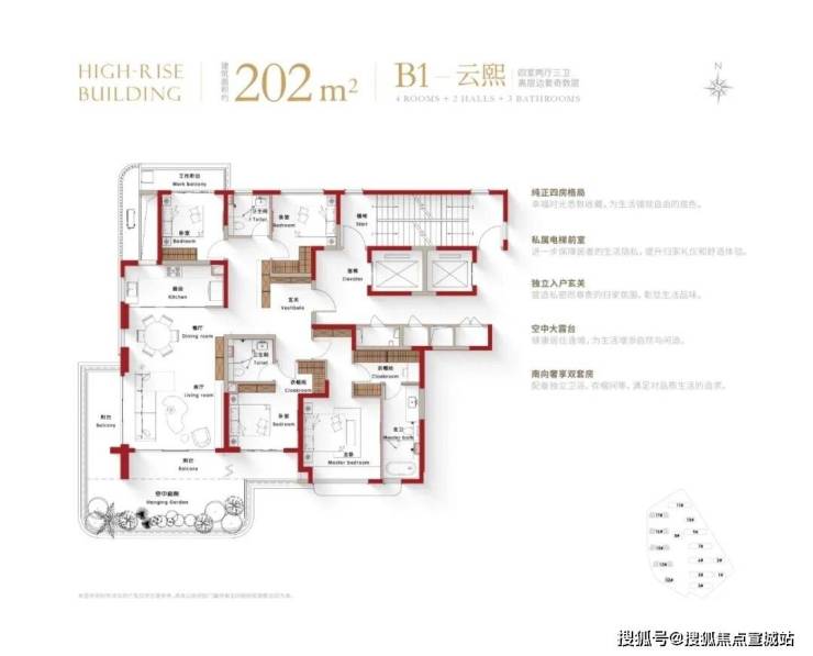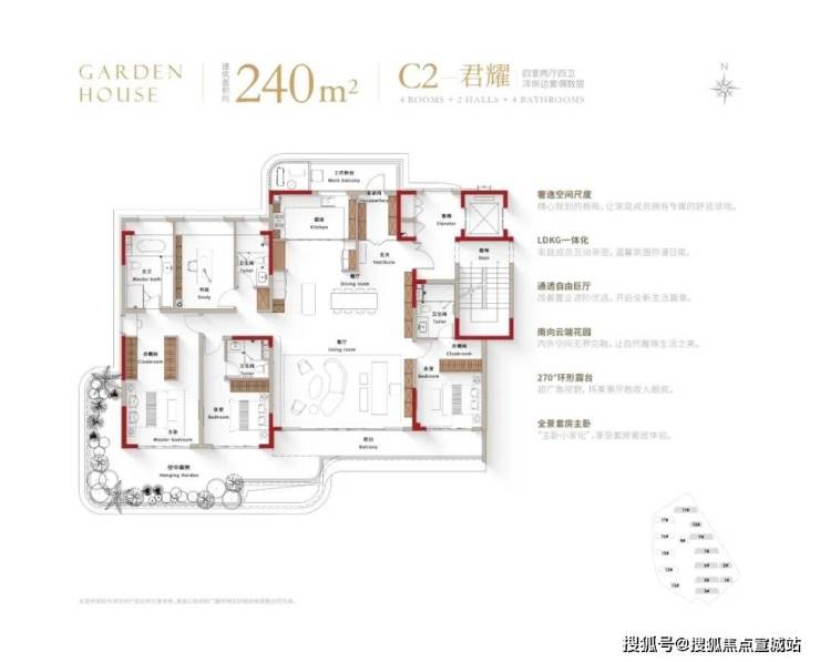 再来看看户型设计,完美呼应了四代宅的超高使用率,空中露台、阳台等各项数据的尺度非常惊人