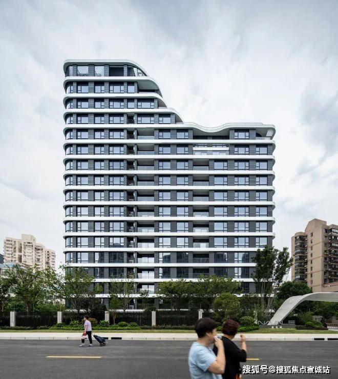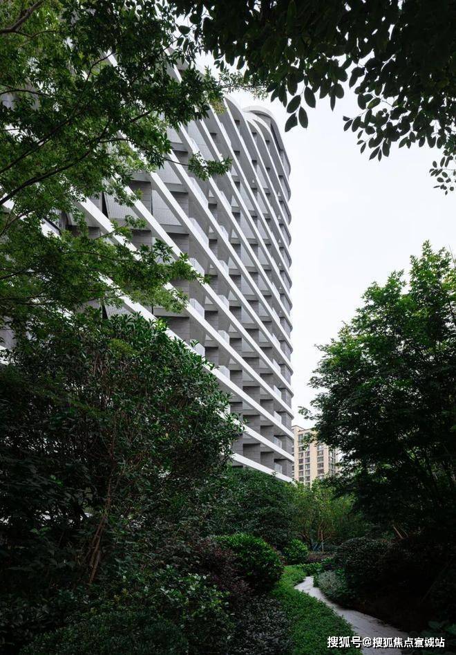 建筑向上层层叠高、向内退进的波浪线型,形成了多维立体的生态居住空间。垂直叠置的弧线形露天观景平台作为私享空间,并根据不同朝向的户型将露台角度开设到最宽,呈现“全画幅”式的景观视野,将城市景观价值最大化的同时,也串联立面转折、观景阳台、屋顶绿化和空中花园,消隐弱化了传统住宅前后错动的复杂轮廓,强化建筑的整体性。柔美的立面山水景观也点染了城市界面,退后的部分更像是传统山水画中的“留白”处理,引人无限遐思。