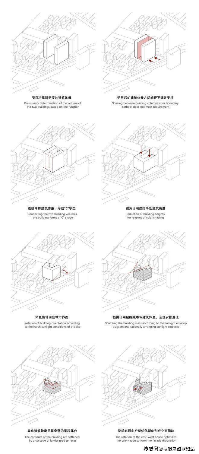 最终,设计确定了单栋“C”形布局的住宅形式,回应基地周边的建筑群落;建筑体量由低到高,以满足新旧混合住宅环绕下基地极为苛刻的日照条件,如梯田和峡谷般层层退台的方式将充足的日光引入每户室内,同时也让建筑唤起都市中人们对中国传统山水自然的回忆。为了适应不同个体差异化的栖居方式,设计师在居住复合体一万余平米的建筑面积中组合了超过30种户型, 同时包含住宅、社区健身设施、社区居委会议室、物业管理等多样化的功能。