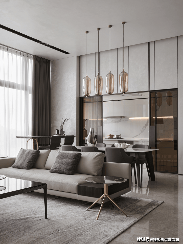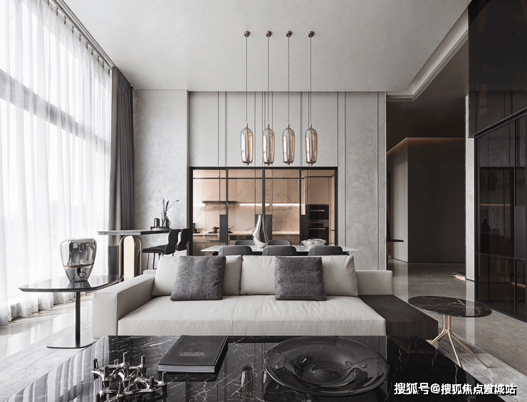客厅后侧是厨房,格挡是采用深色玻璃制作而成的推拉门,内部整体为白色柜面,墙体呼应客厅背景墙,以爵士白大理石为装饰,优雅温厚,细节充盈。