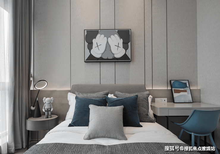 儿童房与主卧一墙之隔,蓝灰色调含蓄温和,简洁的布局使人舒适自在。