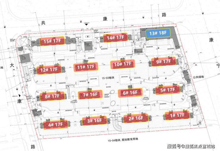四至范围:东至15-06地块(公共绿地)、南至15-04地块、西至大康路、北至共康路,占地面积43500㎡,总建筑面积140051.13㎡,容积率2.20,总户数957户。