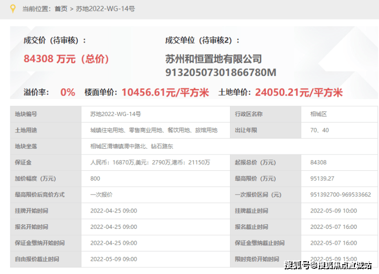 2022年5月9日苏州土拍中,苏州和恒置地有限公司(相城城投)以8.43亿元底价竞得,楼面价10456.61元/m²。地块性质为城镇住宅用地、零售商业用地、餐饮用地、旅馆用地。