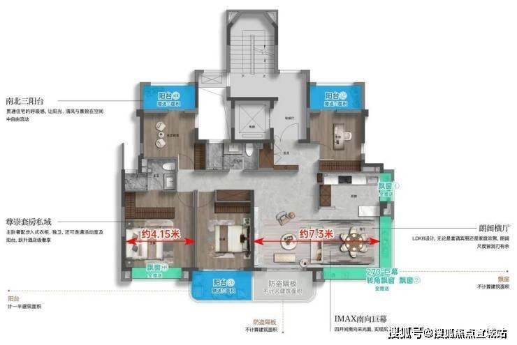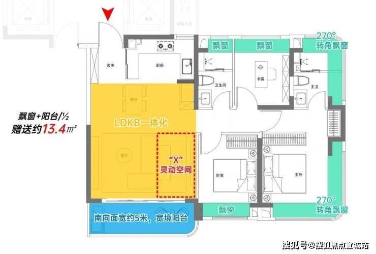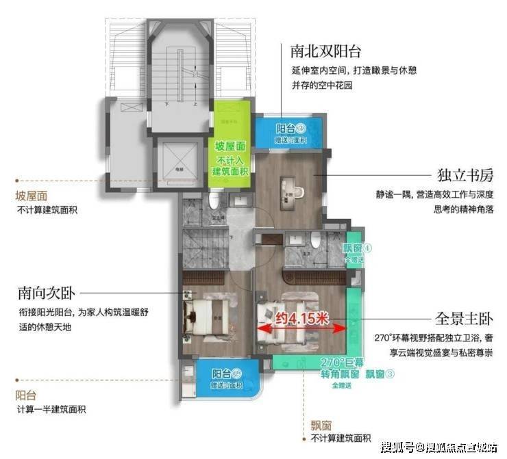 该户型附赠4个飘窗+3露台+1阳合½+挑空+闷顶等,实得率约135%!