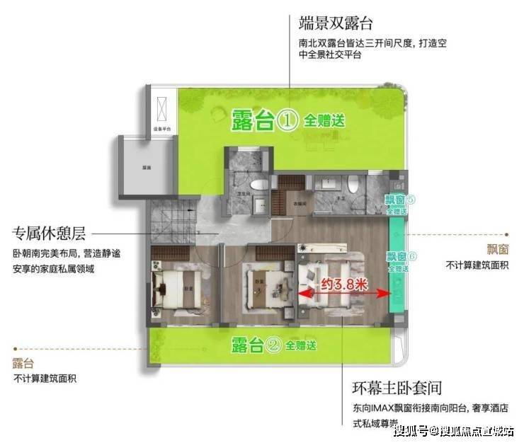 客厅附赠南向露台,同时厨房也附赠飘窗台面(端户),均不计入建筑面积;