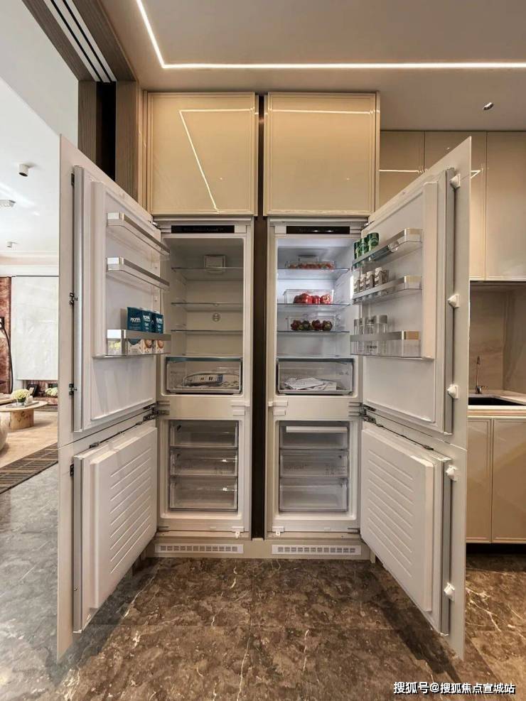 配置博世五件套,包含油烟机+三眼燃气灶+洗碗机+蒸烤一体机+两个嵌入式单开门冰箱;高仪大单槽搭配可抽拉水龙头,并且还加装了美而浦净水器以及汉默斯垃圾粉碎机。