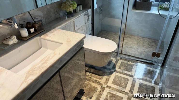 包括卫生间的墙面以及地面均采用了大量的岩板和石材进行铺设,主卫镜柜配置美妆冰箱。
