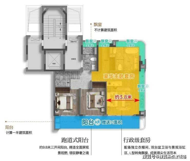 主卧套房南向面宽约3.8米(不含飘窗),边套户型附赠侧边巨幕飘窗,主卫附赠270°弧形转角飘窗;