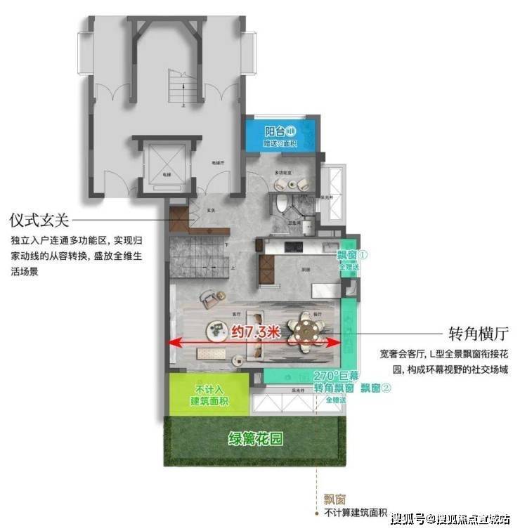 独立入户玄关,并设置大件收纳空间,南向约7.3米面宽客餐厅+附赠270°弧形巨幕转角飘窗;