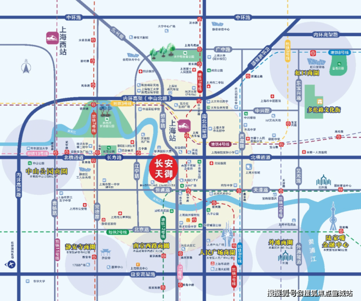 交通配套方面:项目距1号线上海火车站650m、13号线江宁路700m、1/12/13号线汉中路850m