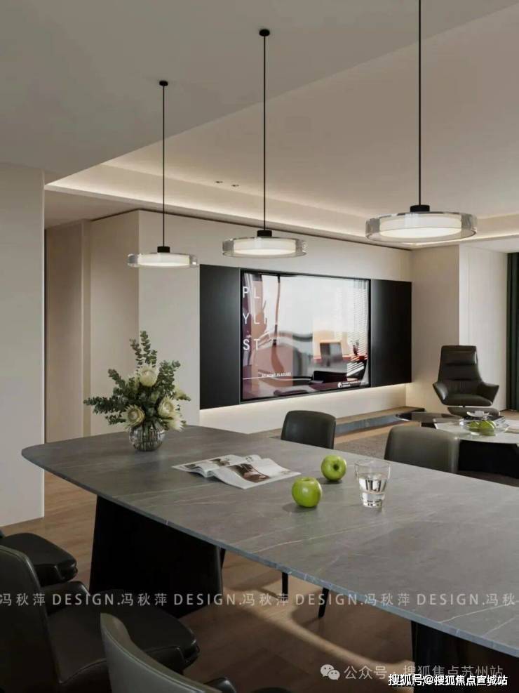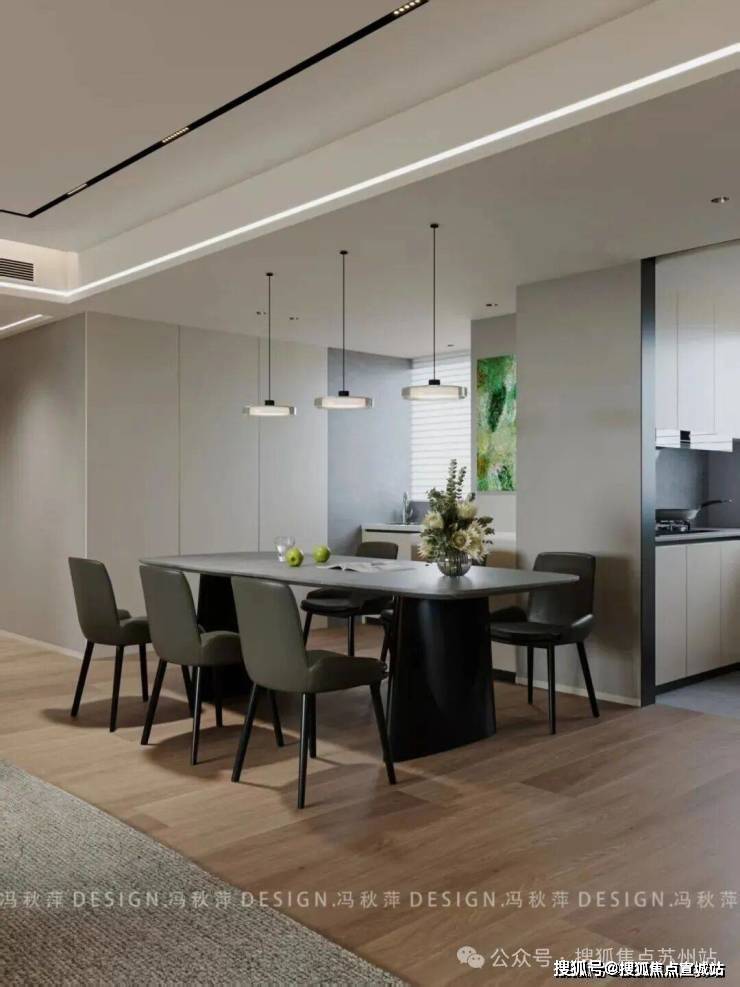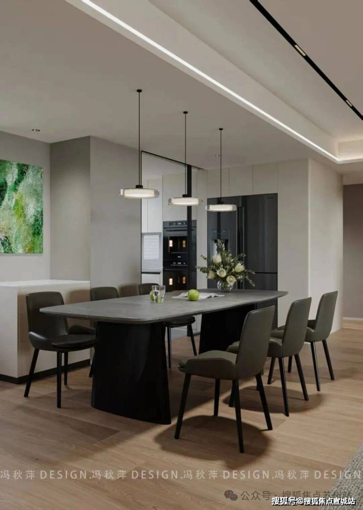 餐厨区域与客厅以开放式格局相连,却通过巧妙的设计手法,自然勾勒出相对独立的用餐天地。一张长形餐桌以灰色石材为面,细腻的纹理如天然的艺术画作,尽显沉稳大气。搭配深灰皮质餐椅,利落的线条纵横交错,为空间注入一份利落与干练。三盏环形吊灯垂坠而下,暖黄的光晕温柔地倾泻在餐桌上,为每一顿餐食赋予了仪式感。餐桌上,精心摆放的花艺与青苹果摆件相映成趣,灵动的气息弥漫其间,让这个餐厨区处处流淌着生活的温度。