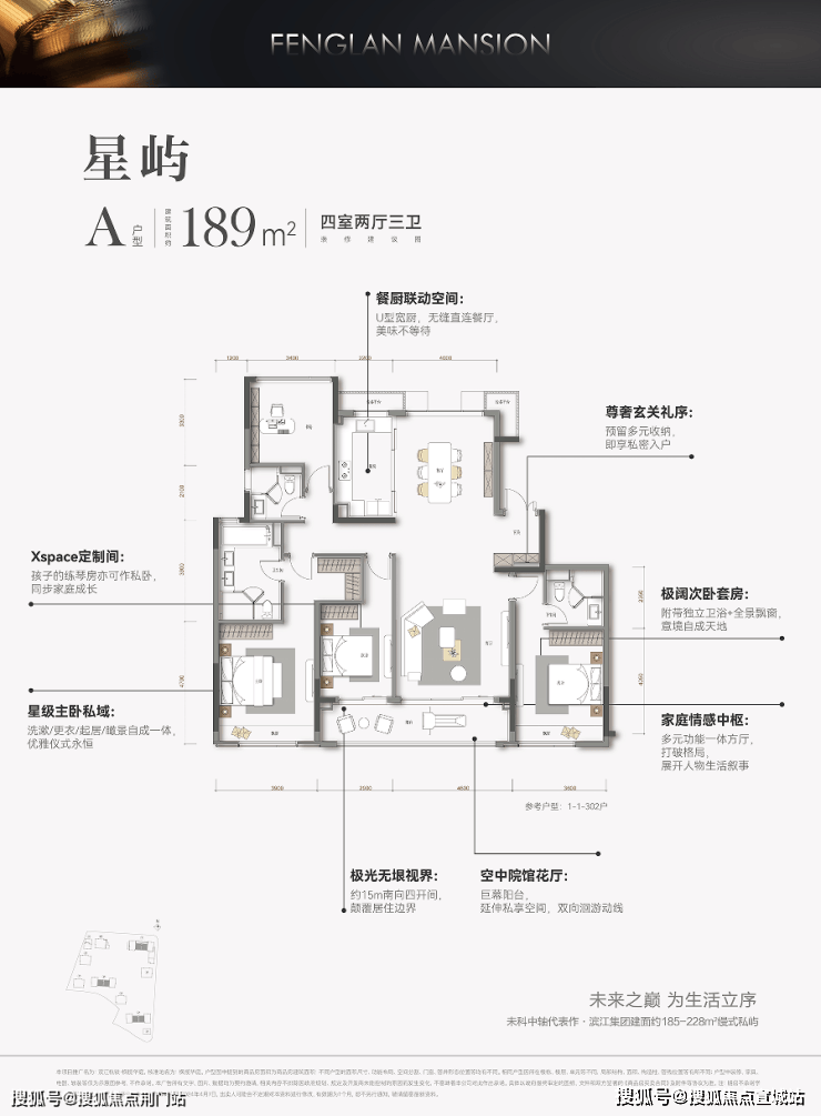 枫揽华庭定位建面约185-228㎡的纯粹大户型,是在高端改善供应极度匮乏的未科当下唯一的优质改善项目。项目占地约32946㎡,总建面约97911㎡,规划了8幢12-17F住宅,可售房源340套。建筑设计由业内著名的gad蒋愈团队操刀。在“四面铝板+大面玻璃”的基础上,顶部窗框和架空层还采用了工艺更加复杂的弧形折角。