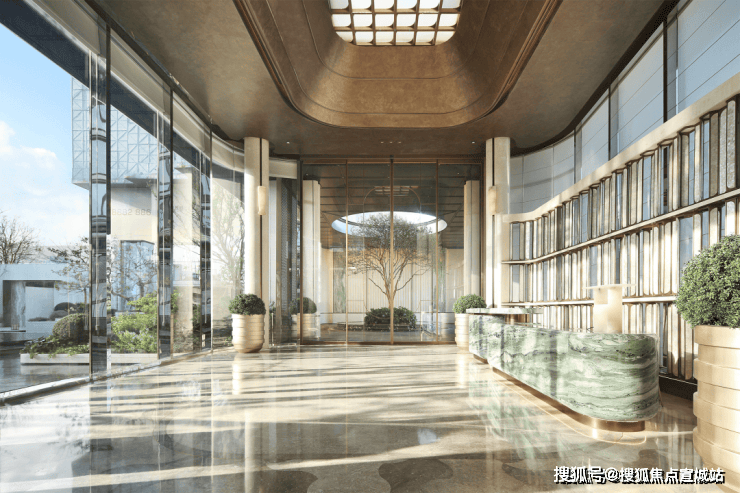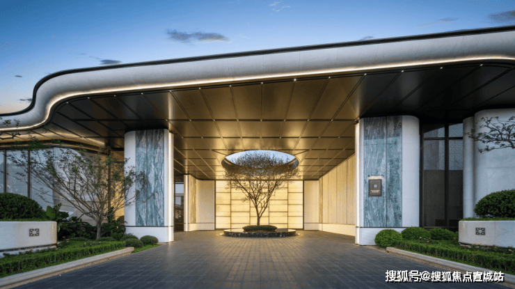 社区主入口是超宽幅门头,宽约80m高约7.1m,两侧的维多利亚绿奢石以及中央的白雪公主透光石很吸睛,浅色的部分则是贝金米黄石材,圆弧的工艺处理也更显温润及价值感,中央栽植的超大紫薇树拥有约60年树龄,底部则是采用宝格丽黑奢石作为基座。