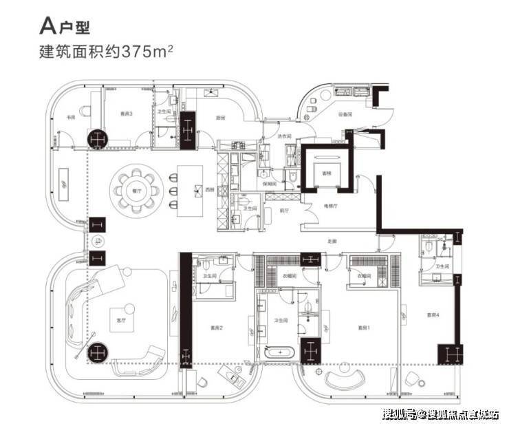 主力户型:建面约375㎡,赠送100㎡,实际使用面积达475㎡,得房率93%,采用6房6卫+双玄关+独立家政间的配置。