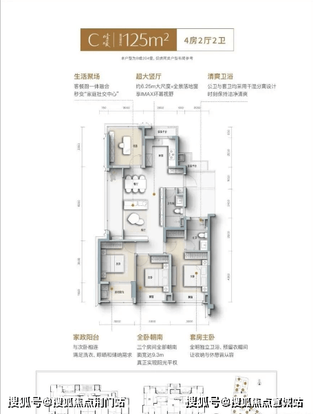 户型特点:部分户型如105㎡南向采光超10米,109㎡、139㎡和169㎡设计成四开间朝南,169㎡户型甚至达到五朝南,南向开间达17.3米。