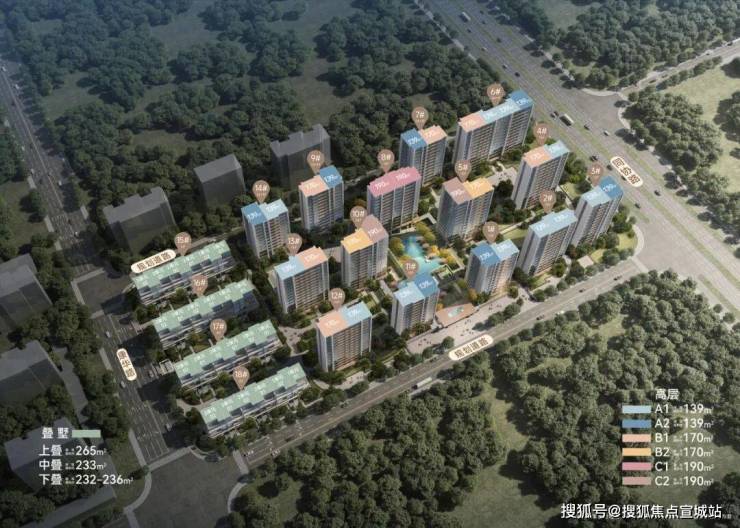 14幢13-15层小高层395户(全2梯2户)+4幢叠墅72户,高低配,总套数467户。高层户型139、170、190方,架空层5-8米,高层户内3.1米层高;叠墅户型232-260方。