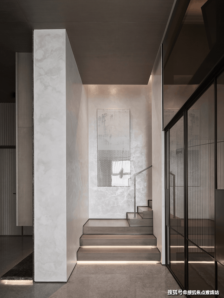 一层是书房,内部以白色条纹墙面为主,形式简约的展示柜别具一格.