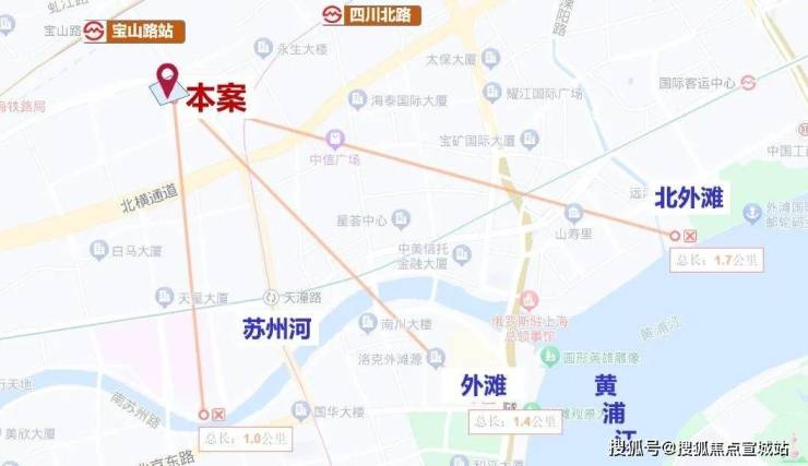 仅从图上看,该地块直线距苏州河约1公里,直线距外滩约1.4公里,直线距北外滩约1.7公里,直线距3/4号线宝山路站约300米,直线距10号线四川北路站约560米,区位优势明显。
