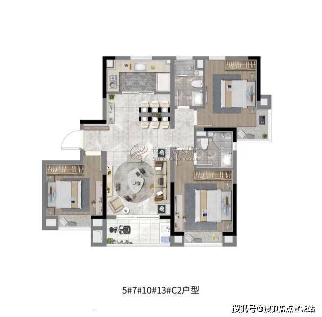 建面约108㎡3房2厅2卫,做到了三开间朝南+双阳台设计+主卧套房设计+南北通透,该户型得房率非常高。