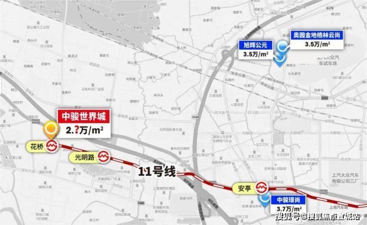 交通配套:距离地铁 11 号线花桥站 175 米,与苏州 S1 号线(建设中)交汇,东临沿沪大道、北临 312 国道。