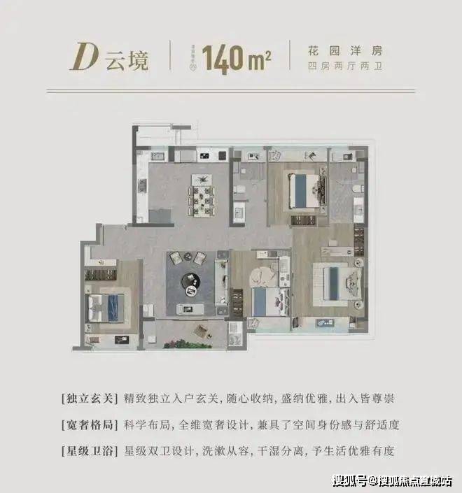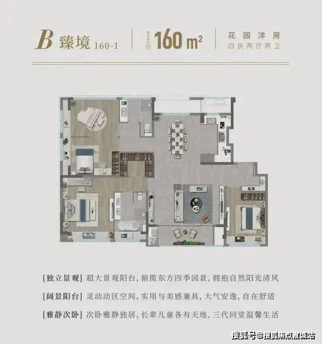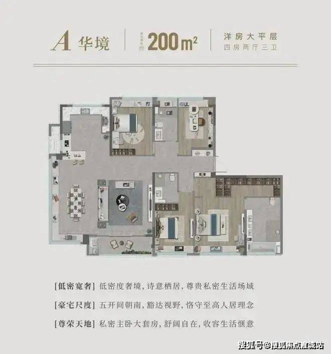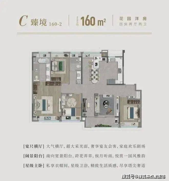 洋房:建面约 140㎡、160㎡、200㎡,户型为 4 房 2 厅 2 卫或 4 房 2 厅 3 卫。