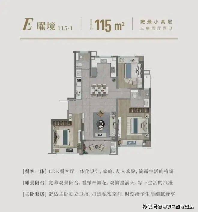 高层:建面约 115㎡,为 3 房 2 厅 2 卫。