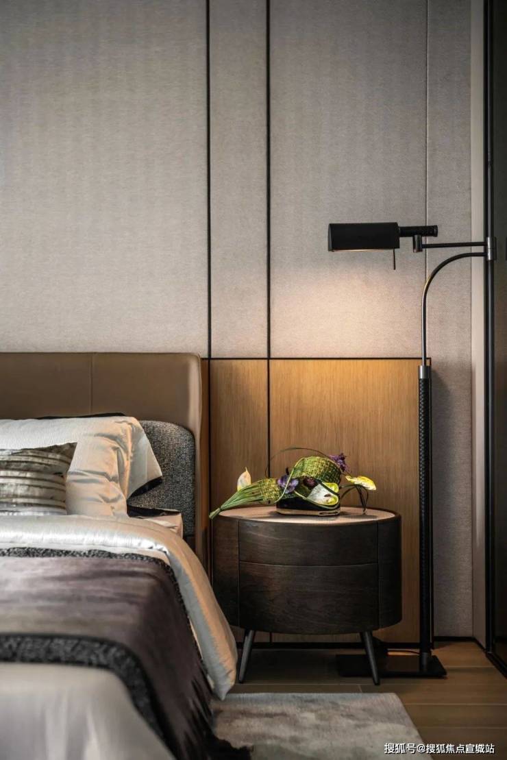 次卧的色调相对更为深邃,设计师通过不同的色彩选择,为静谧的氛围赋予了别样的诠释.有的空间明亮温暖,有的则内敛深沉,各种高品质材料相互搭配,编织出柔软而舒适的触感,再辅以恰到好处的艺术装饰,将空间的高级感提升到新的高度.