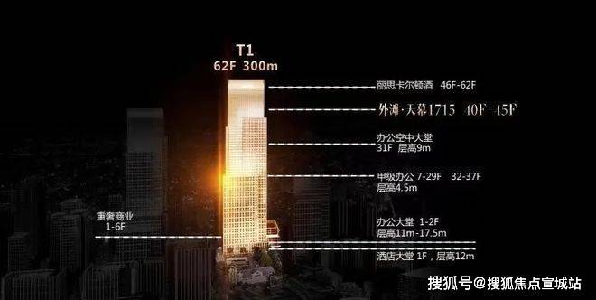 T1-300米超高层塔楼上部46-62层为五星级酒店(丽思卡尔顿)、38,40-45层行政公馆,中部7-37层为甲级办公,底部为商业及大堂。