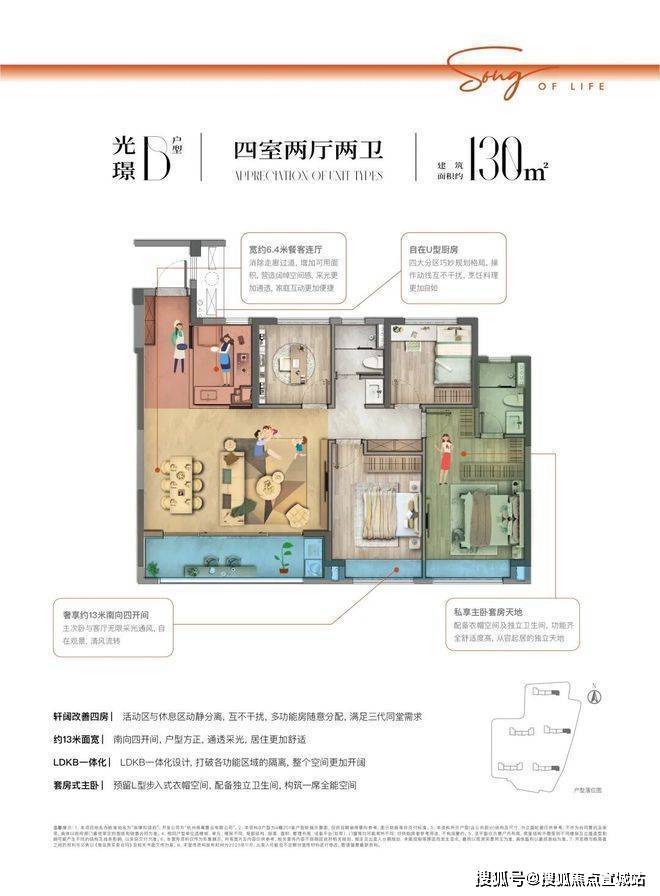 约106㎡户型点评:双联阳台约6.7米面宽,加设L型俯景面,满足晾晒、赏景、采光三重需求,LDKB一体化设计,打破各功能区域的隔离,整个空间更加开阔,开放式厨房 U型厨房,封闭敞开随心切换,高效台面设计,操作动线更加合理。