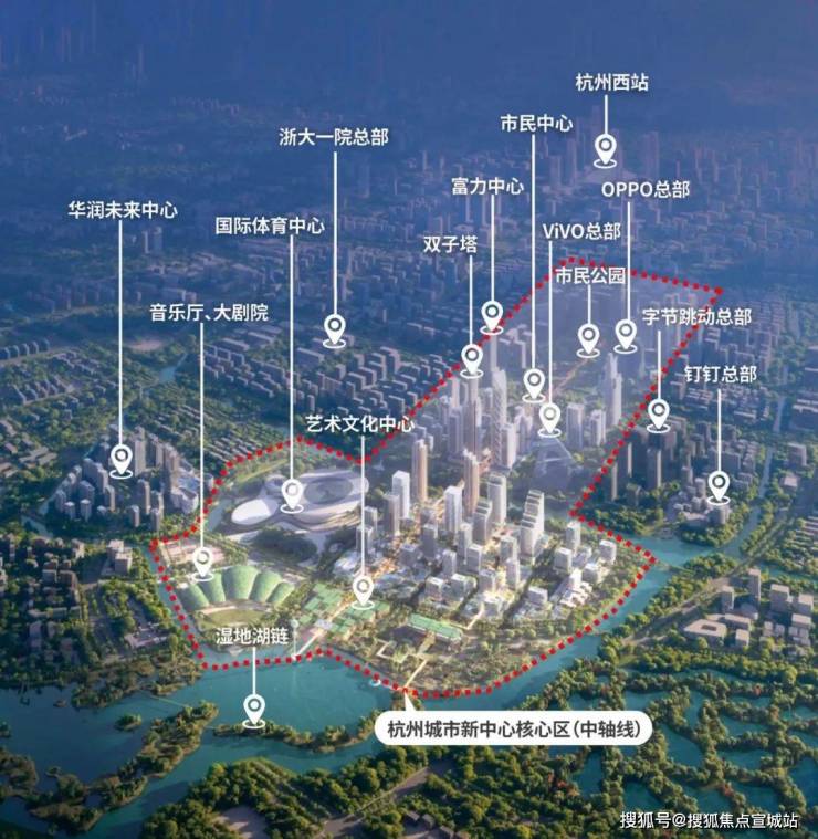 从北到南,EFC奥克斯中心为代表的商务办公集群,阿里、钉钉还有绿汀路TOD两侧万象综合体、国际体育中心等。