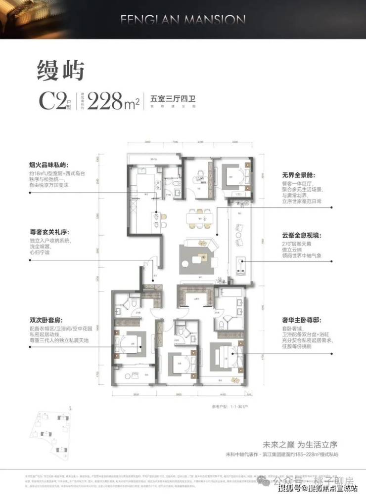 228㎡五房两厅四卫:三开间朝南,南向面宽11.5米,带独立玄关,户型整体格局类似185㎡,三套房设计,大主卧带步入式衣帽间,双阳台设计,南侧一主卧带阳台,餐客厅一体,边厅阳台7.6米,北侧同时布局两房。