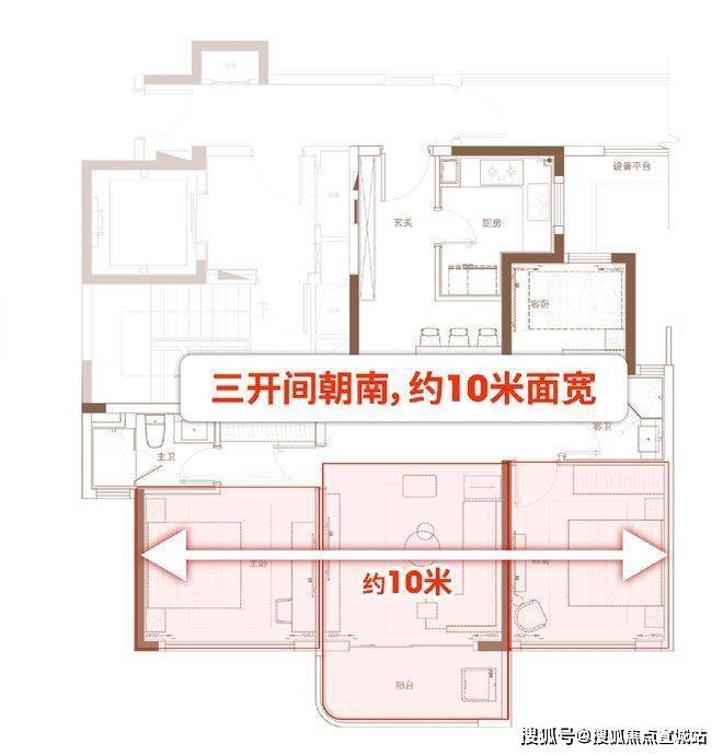 三开间朝南,南向面宽达约10米,阳光充足;餐客厅与阳台形成流畅动线,社交空间舒适开阔;弧形阳台放大景观视野;主卧预留独立衣柜空间,卫生间罕见南向采光,舒适度拉满。