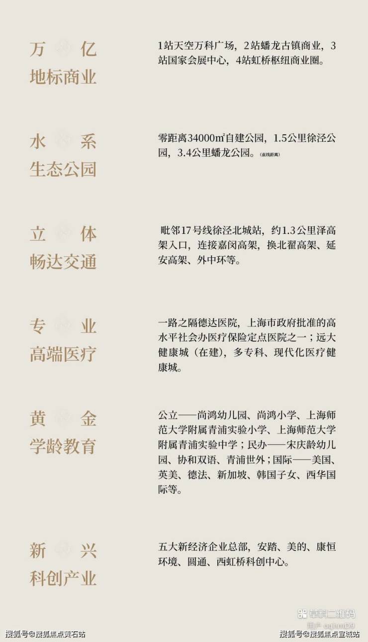 商业:家门口就是徐泾北城商业广场;约1公里就是10万方大型shoppingmall——万科天空之城商业,一站地铁即可到达。除此之外往东约4公里公里上海购物网红打卡地蟠龙天地古镇商业;往南驾车约4.5公里青浦奥特莱斯:往南或者往北驾车约8公里到达青浦山姆会员店及闵行Costco。