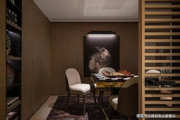 书架以及空间中预先设定的轮廓线条,精准地勾勒出隔而不断的空间形态.书架仿佛具有神奇的魔力,打破了空间的界限,将会客区、餐厅、书房与文化韵味巧妙融合,每个区域既相互关联,又有着各自独特的层次,形成了一种和谐而又富有变化的空间秩序.